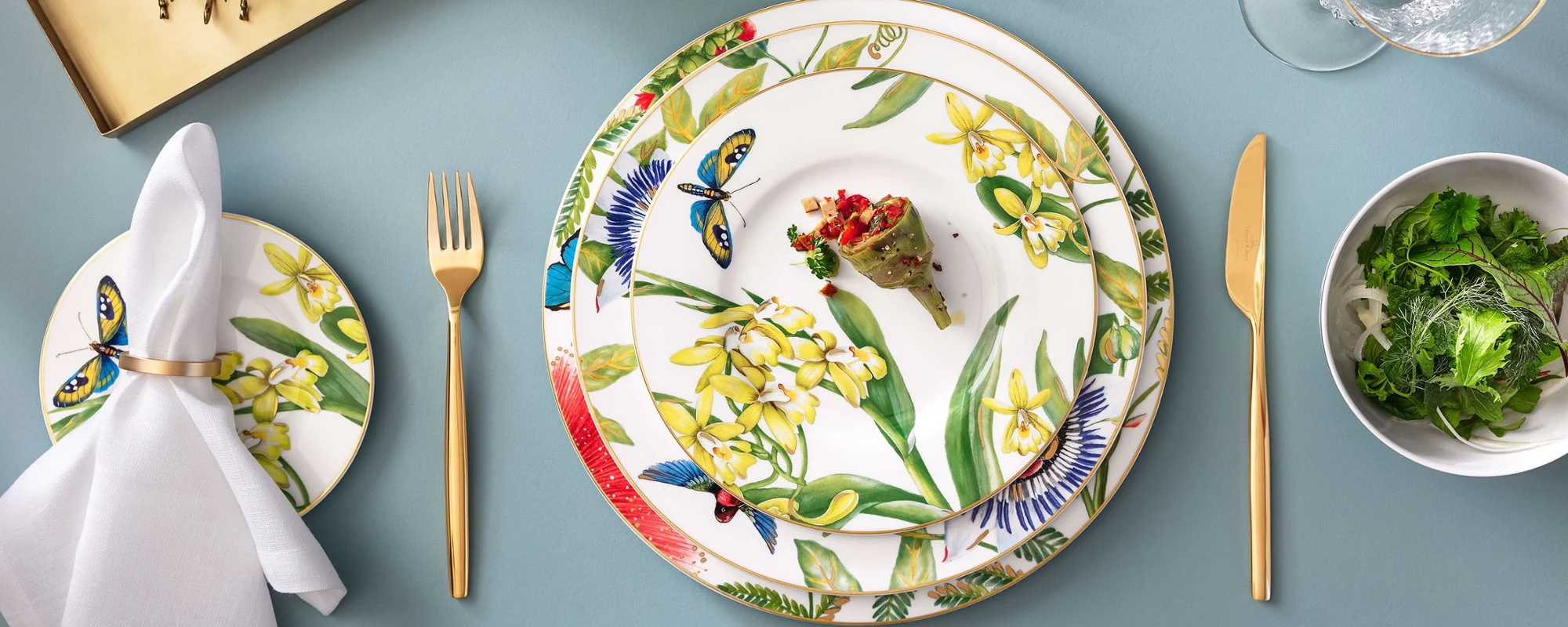 The Villeroy & Boch Amazonia decor captivates with intense colours and delicate shapes. The radiant yellow hues of orchids, the blue of passion flowers and the delicate details of hummingbirds and maracuja butterflies create an almost three-dimensional effect.