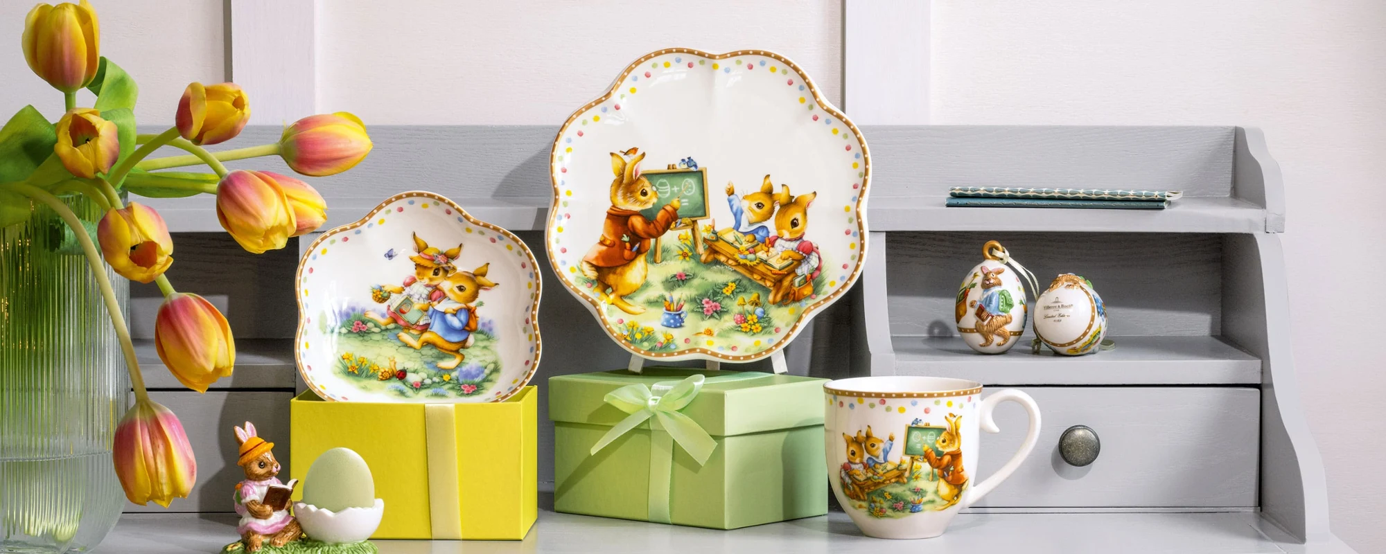 The loving designs and nostalgic charm of the Annual Easter Edition 2025 bring the story of the bunny school to life in your home. Inspired by a classic children’s book, the collection combines colourful spring themes with hand-painted details and gold-coloured accents that create a warm and harmonious atmosphere.
