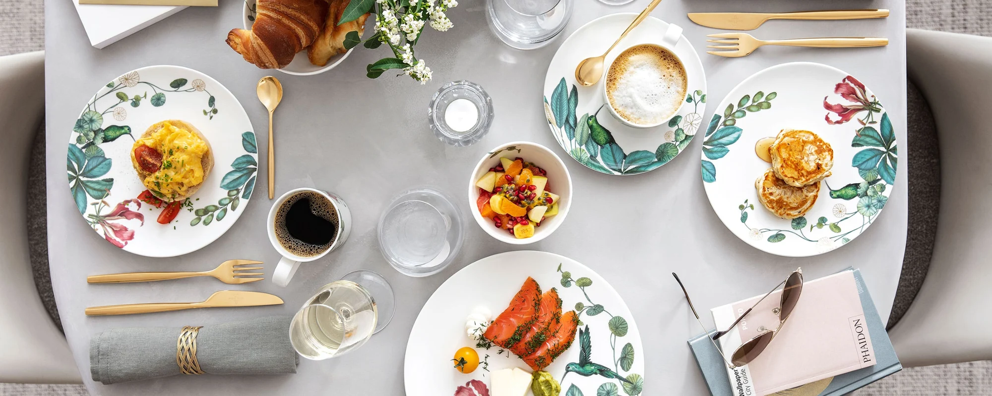 A table set with a cup of coffee and a Villeroy & Boch white Artesano plate with food.
