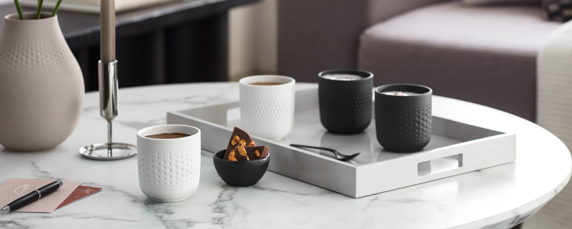 Coffee sets come in a wide range of materials. At Villeroy & Boch, the selection mainly consists of porcelain and earthenware. Villeroy & Boch also offers Premium Bone Porcelain coffee sets.