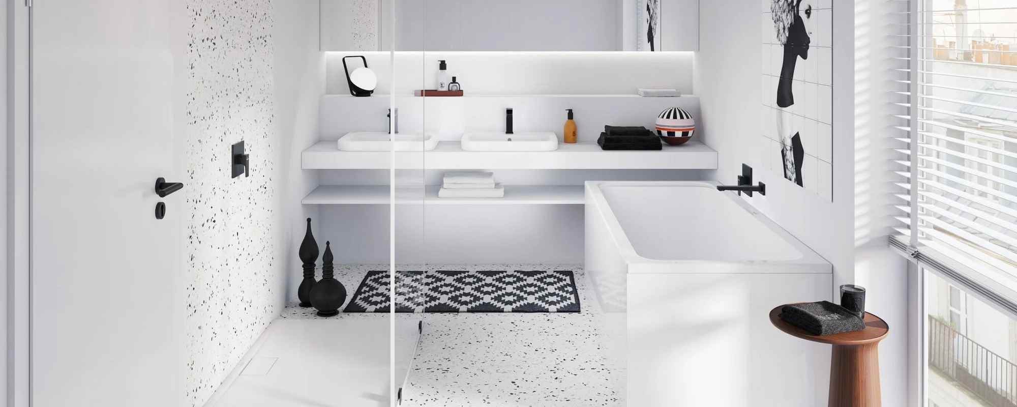 A combination of black and white in the bathroom creates a very special contrast. Use white as the base colour and complete the look with black accessories. Black furniture and white ceramics will create a a very contemporary mood. Textiles with geometric black-and-white patterns are a great choice too.