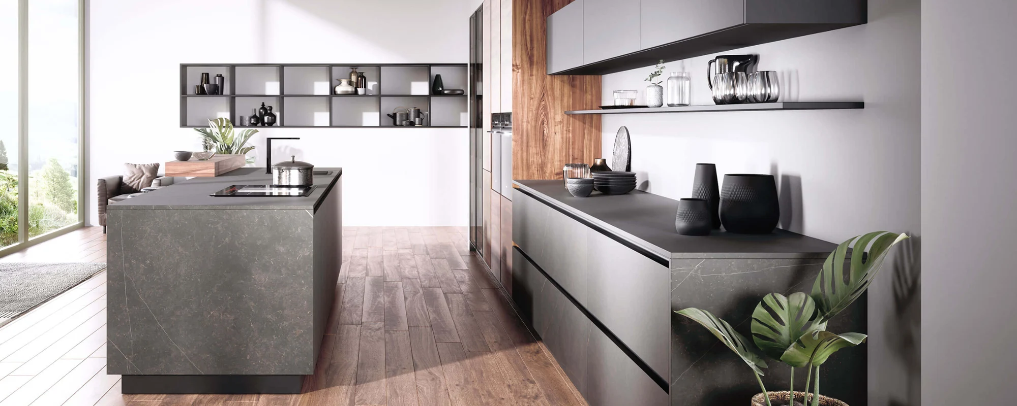 For you to feel comfortable in your open-plan kitchen, you need to create the right atmosphere. To achieve a well-balanced overall look, it’s important for the open-plan kitchen to coordinate with your living room. Or you can be creative with the colour scheme. Open-plan kitchens are usually flooded with light, so furniture in darker colours is often used. You can introduce some industrial chic with concrete worktops and matching metallic accessories. However, warm wood colours and pastel shades are also popular in modern kitchens.