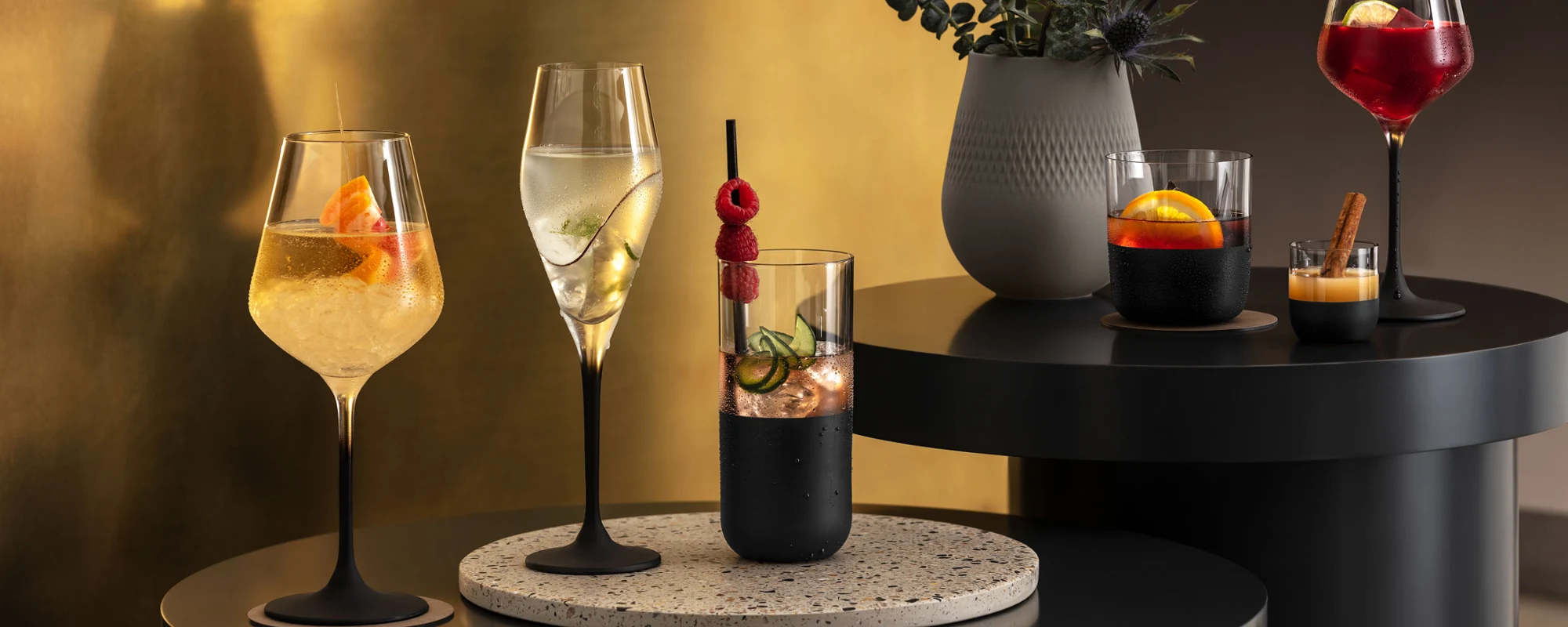 The perfect balance of colours and details is essential for a stylish Halloween dinner party. For a dramatic look that harmonises perfectly with the Halloween theme, deep black crockery with a textured surface is an ideal choice. Choose glasses with subtle black accents to emphasise the mysterious effect of the black tableware. Stylish glasses and fine black or gold cutlery will add an elegant note to the table without being overpowering.